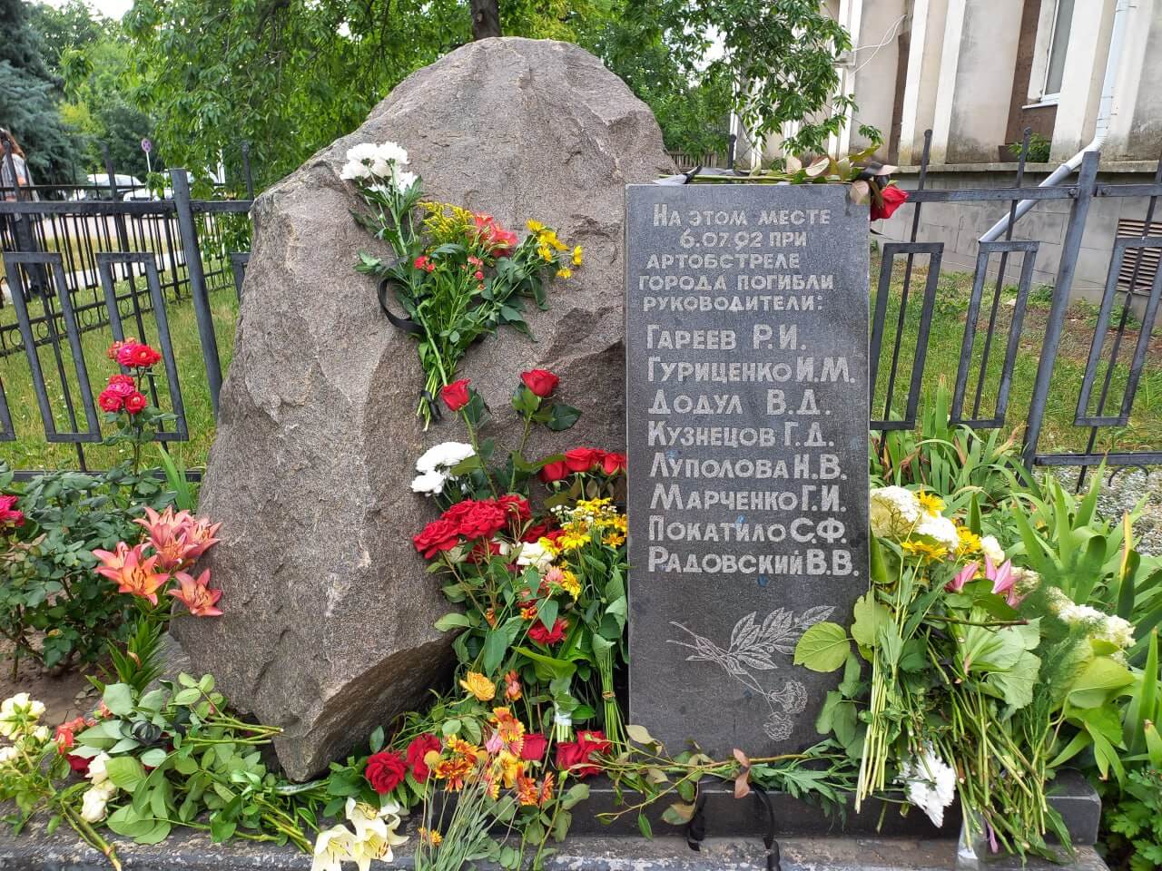 Снаряд влучив у будівлю міського виконавчого комітету й обірвав життя вісьмох людей: Рафаела Гареєва, Іллі Гуриценка, В’ячеслава Додула, Геннадія Кузнецова, Наталії Луполової, Галини Марченко, Степана Покотила і Василя Радовського. Ці люди під час бойових дій у Дубоссарах, починаючи з 2 березня 1992 року, ризикуючи своїм життям, підтримували життєзабезпечення міста і сіл району. Постачали продукти харчування і все необхідне в дитячі садки, медичні установи, об’єкти торгівлі, на позиції захисників Придністров’я. І на п’ятому місяці збройного конфлікту, внаслідок спланованої провокації, ці люди загинули. В пам’ять про них біля будівлі державної адміністрації встановлений гранітний знак, до якого щороку покладають квіти.