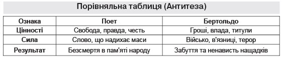 Антитеза – це основний прийом у творі, протиставлення (Поет проти Бертольда, воля проти рабства, пісня проти золота). Допомагає яскравіше побачити конфлікт.